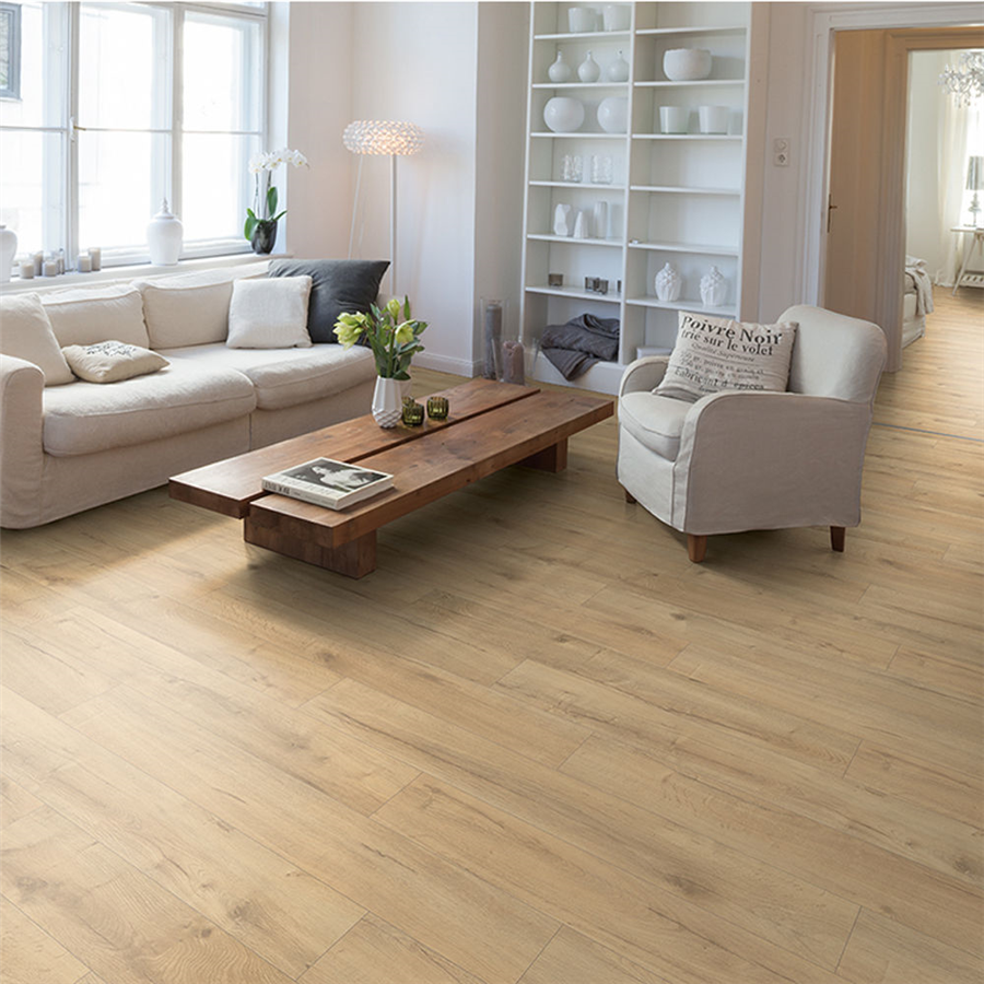Suelo laminado AC4-32 de 8 mm 1 lama. Acabado roble loja natural. Dimensiones de la tablilla: 1291x193x8 mm. Superficie por paquete: 1,99 m2.