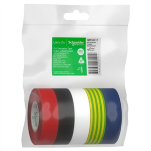 Cinta aislante eléctrica de medidas 20x19 mm. Pack de 5 unidades en color rojo, negro, blanco, azul y amarillo/verde de la marca Schneider