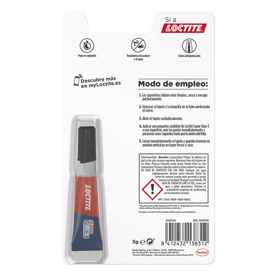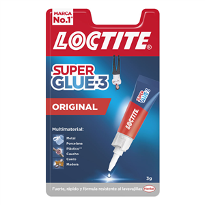 Gel transparente Loctite Super-Glue 3 Original pega al instante la mayoría de materiales. 3 gr.