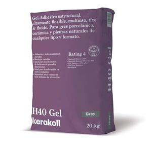 Gel adhesivo estructural H40 Gel Gris, altamente flexible, multiuso, liso y fluido. Para gres porcelánico, cerámica y piedras naturales de cualquier tipo y formato. Saco 20 kg