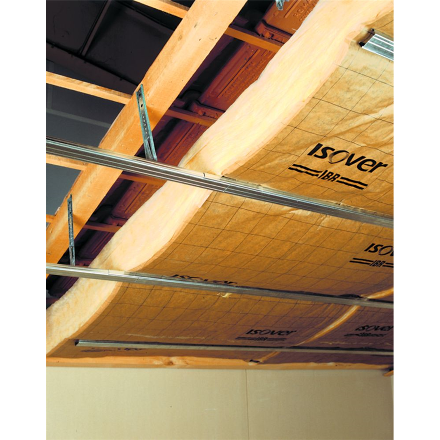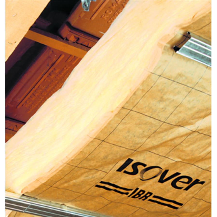Rollo lana de vidrio Isover revestido por una de sus caras con un papel kraft que actúa como barrera de vapor para aislar buhardillas y falsos techos. Medidas: 12000x600 mm. Espesor: 80 mm. 14,40 m2.