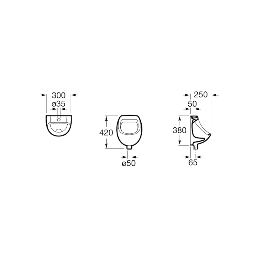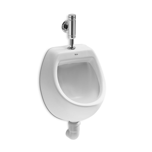 Urinario compacto Roca Mini de porcelana con entrada de agua superior. Medidas: largo 300 mm, ancho 250 mm, alto 420 mm.