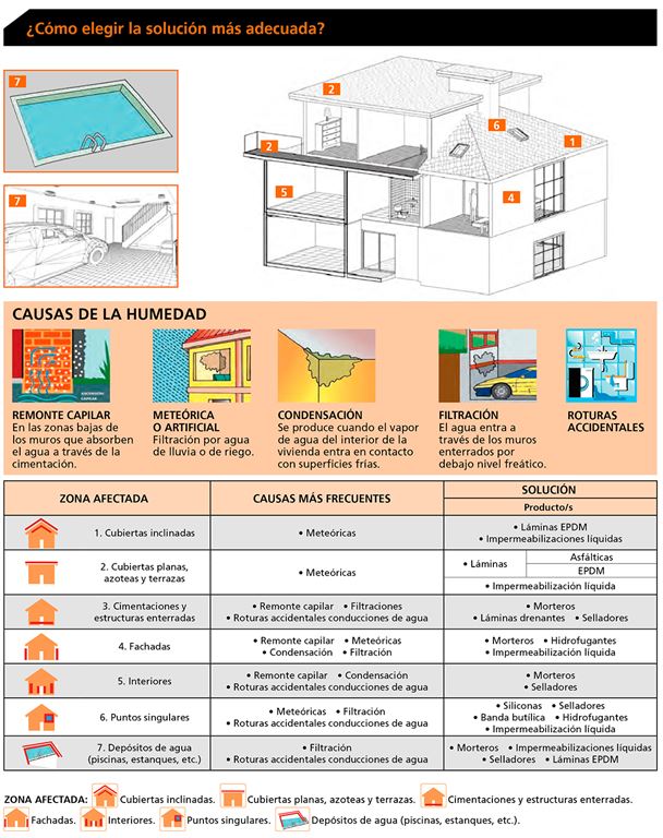 A continuación vemos las situaciones más comunes en cuanto a zonas afectadas por humedades, sus posibles causas, y cuál sería la mejor solución o los productos a utilizar.