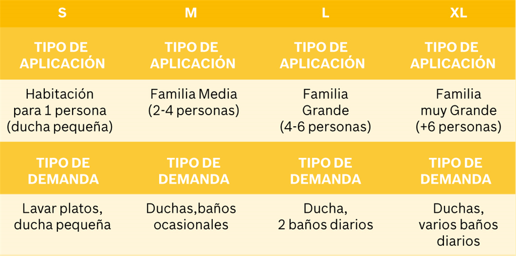 perfil de consumo, que es la mejor forma de comprender el rendimiento esperado de los calentadores, en casa o en edificios que usan una gran cantidad de agua caliente todos los días (por ejemplo, hoteles, hospitales y restaurantes).De forma que para maximizar el retorno de la inversión en un nuevo sistema de agua caliente o de la calefacción, el proceso tiene que estar muy calculado y las necesidades ajustadas a cada proyecto. La configuración será diferente dependiendo de la salida de agua caliente (es decir, cuándo y cuánta es usada), de las condiciones atmosféricas locales y de la temperatura del agua deseada.Aquí podéis ver un cuadro de los calentadores de los perfiles de