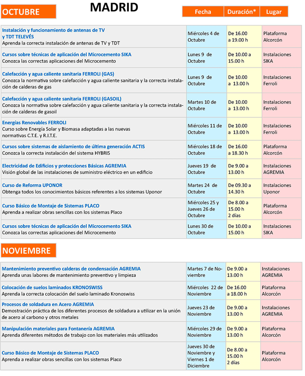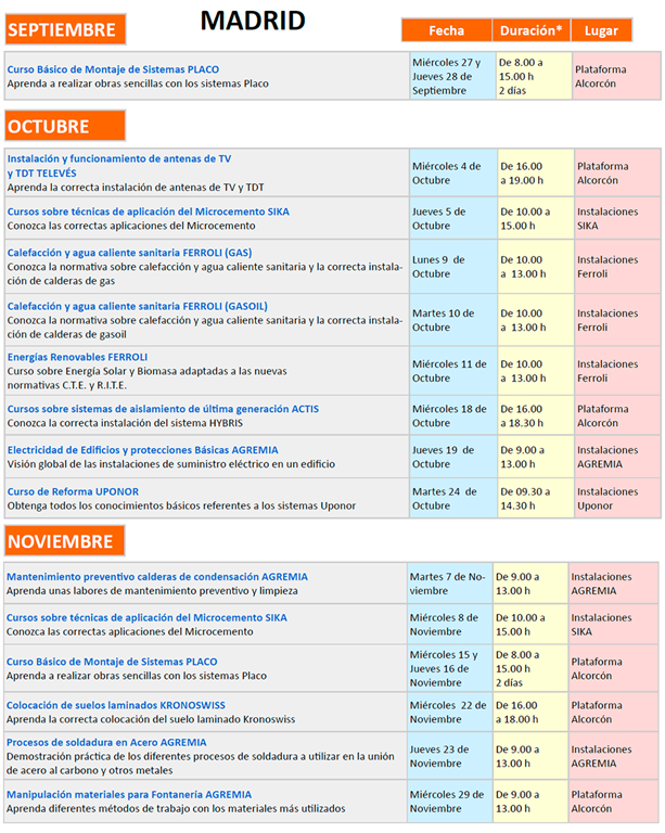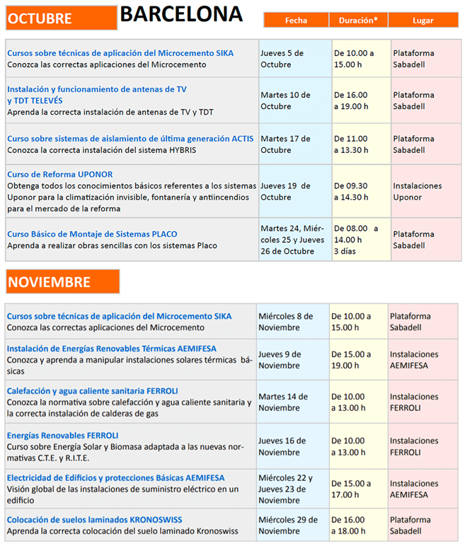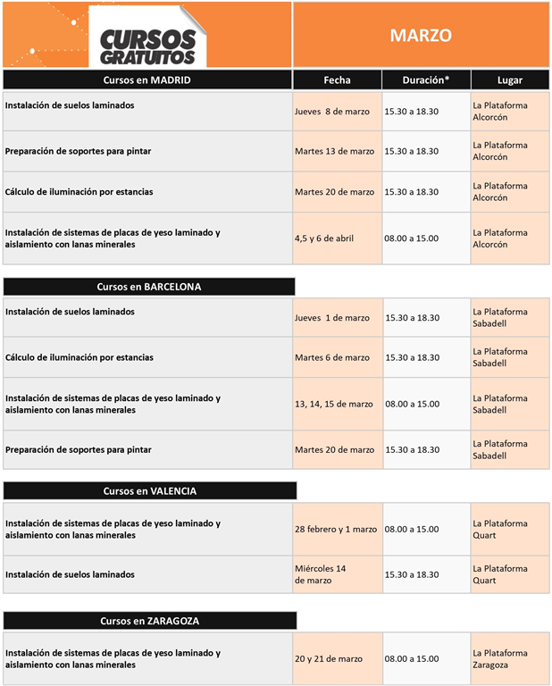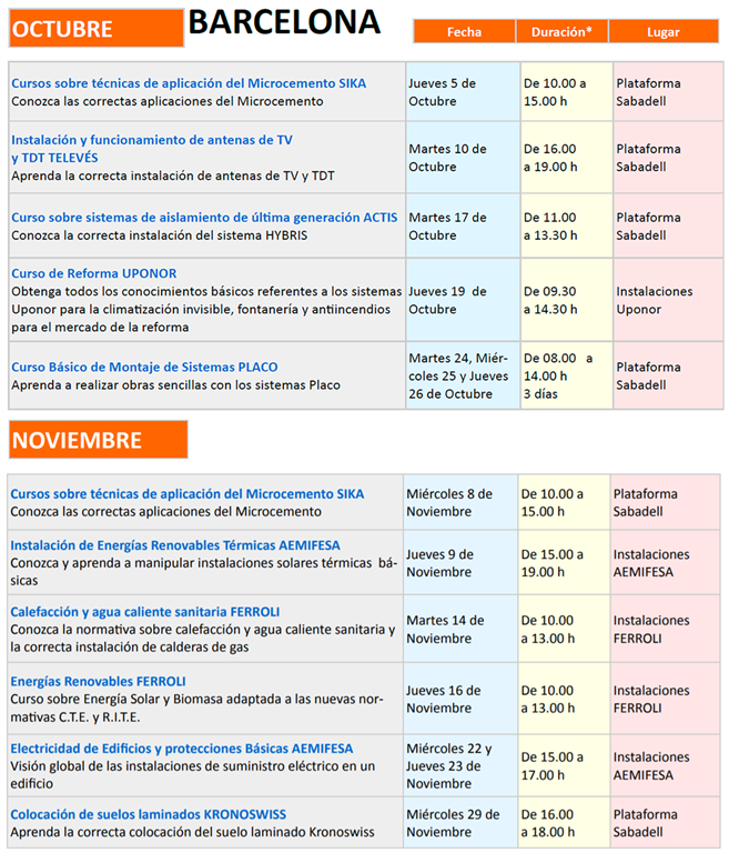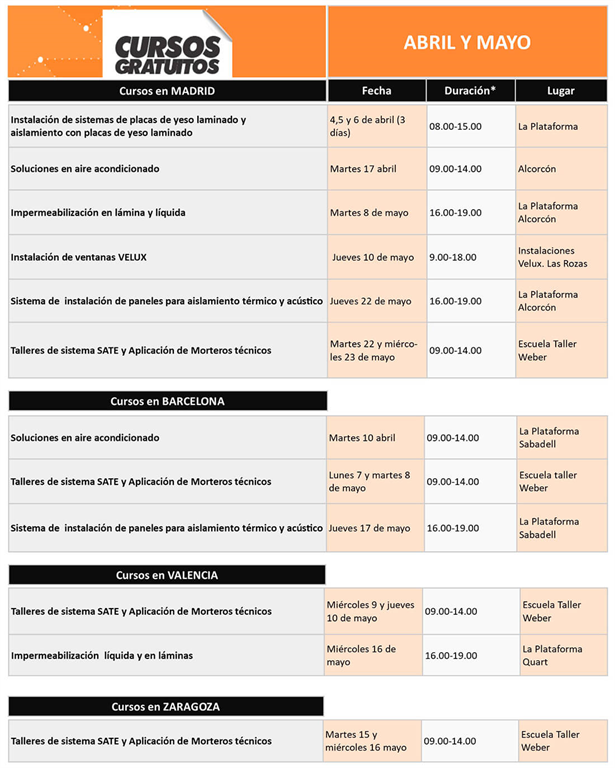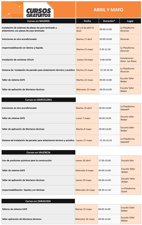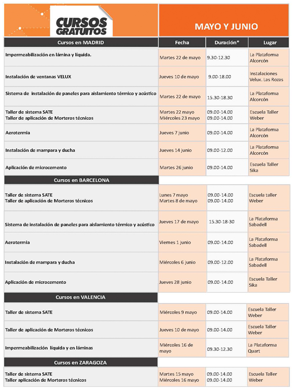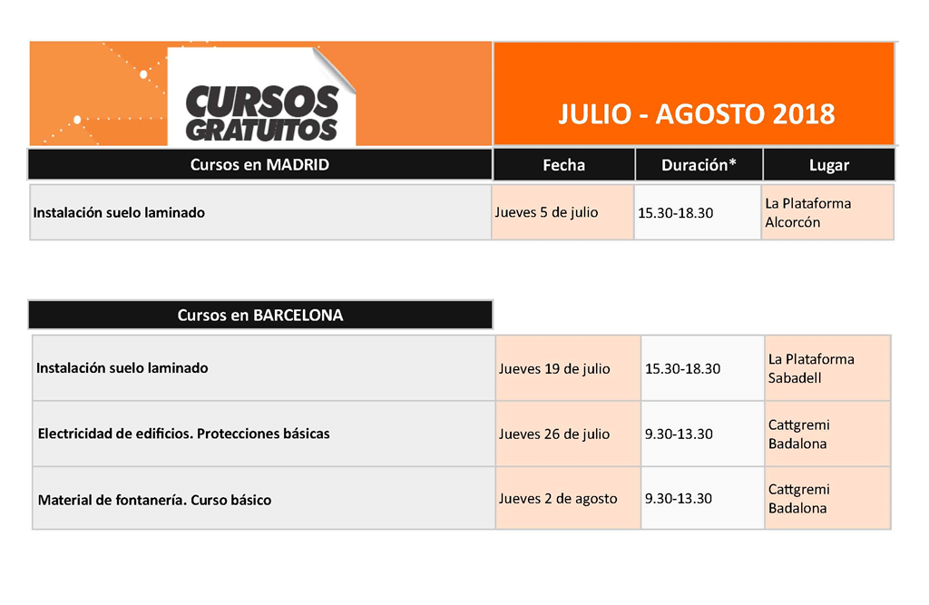 Cada mes continuamos renovando nuestra oferta de cursos de formación gratuitos para los profesionales de la construcción, la obra y la reforma. Estas formaciones tendrán lugar en Madrid, Barcelona, Valencia y Zaragoza durante los meses de julio y agosto.