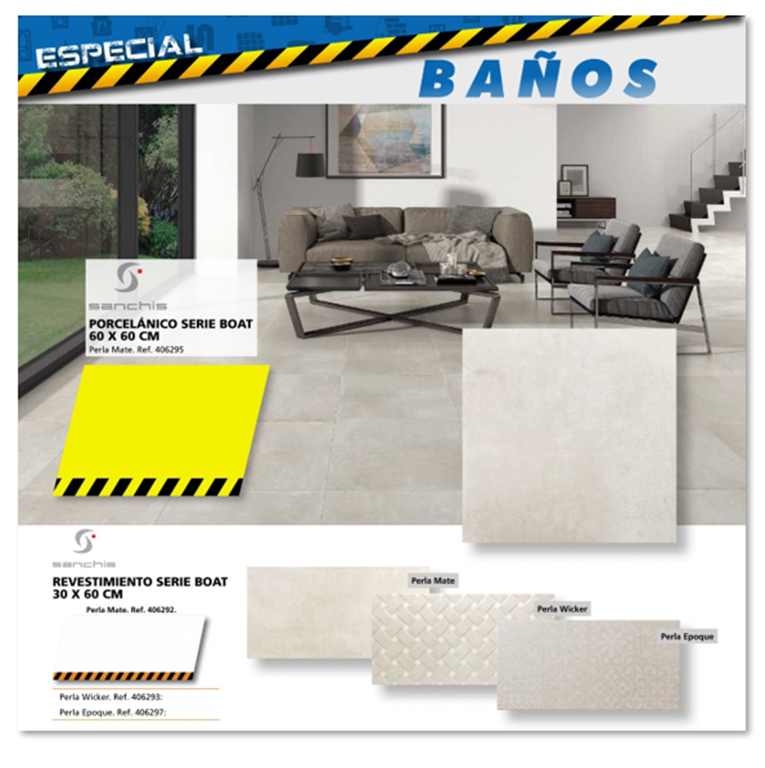 pavimento porcelánico Serie Boat (en 60 x 60 cm). Una solución idónea para baños por su resistencia a cambios de temperaturas y al agua, así como también por su elegancia y versatilidad, capaz de crear espacios únicos con mucha personalidad.