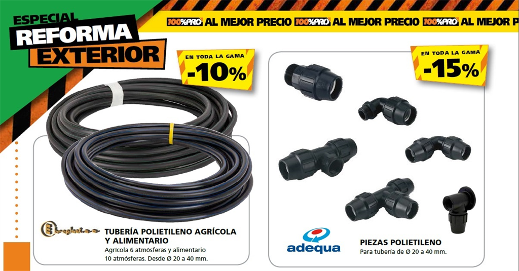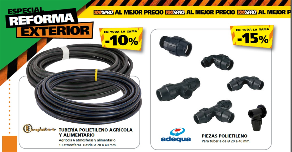 Y no nos olvidamos de las barandillas con accesorios en acero inoxidable, los sistemas de riego por goteo y aspersión con 15% de descuento, mangueras (-10%). También encontraréis