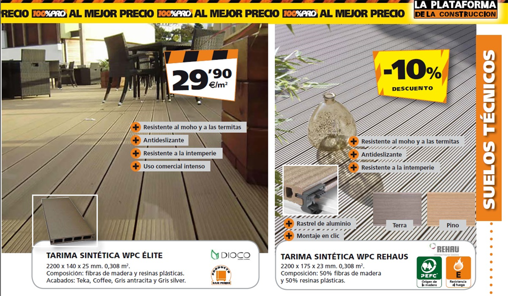 madera para el jardín o el entorno de la piscina, encontraréis variedad de lamas de madera tratada, resistentes a la intemperie, así como tarimas sintéticas anti-moho y termitas.
