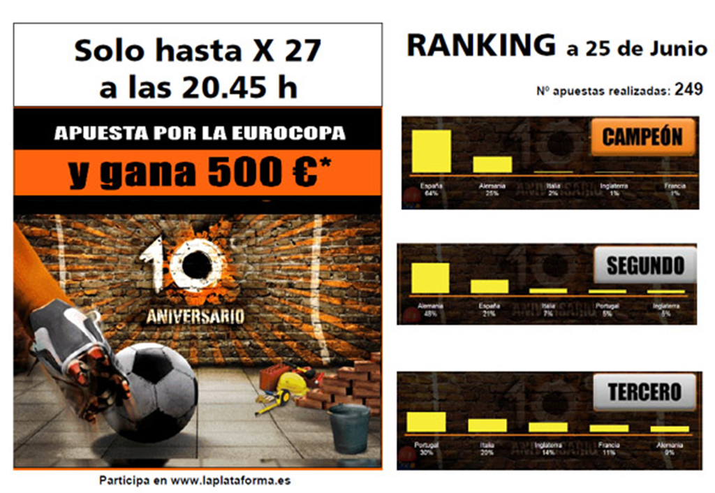 “Apuestas por la Eurocopa”, concurso en el que se puede ganar un descuento de 500 euros. ¡Daos prisa porque este miércoles, antes de la primera semifinal (España-Portugal a las 20,45 horas) se cierran las apuestas! ¡Mucha suerte para todos y también para nuestra selección! En el ranking de apuestas va ganando España. ¡Mirad!