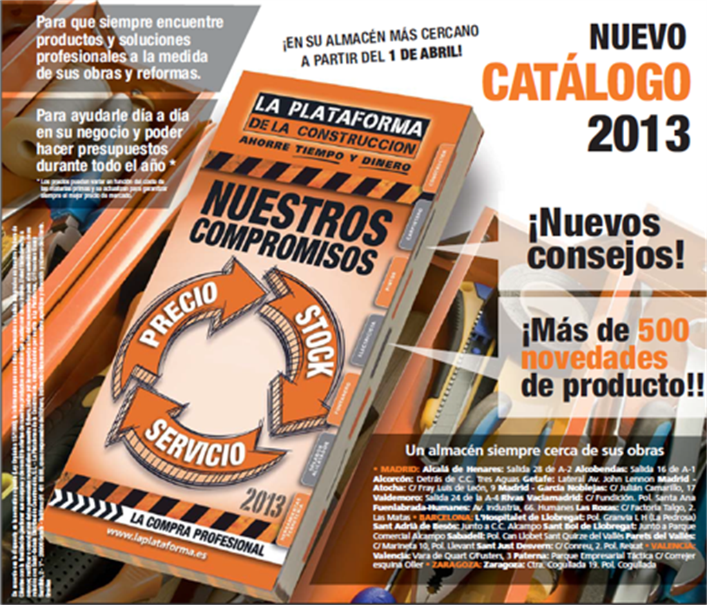 servicio, precio y productos en stock, hacen el nuevo catálogo de La Plataforma de la Construcción la herramienta imprescindible para todo profesional. ¡Ven a recogerlo a a partir del próximo 1 de abril!
