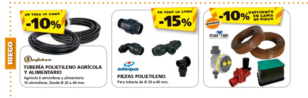 instalación de riego: tubo, electroválvulas, programadores o arquetas de Maxrain y piezas de polietileno de Adequa.
