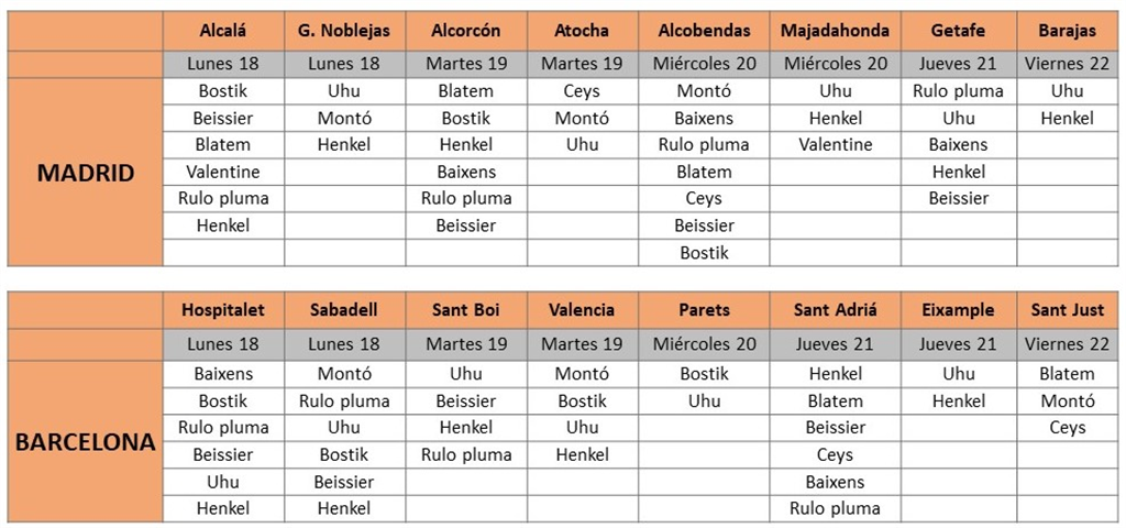 La Semana de la Pintura llega una vez más a La Plataforma de la Construcción y lo hace ¡cargada de novedades! Del 18 al 22 de junio podrás encontrar a los fabricantes de nuestras marcas más habituales en los almacenes de La Plataforma. Durante 5 días podrás resolver todas tus dudas en materia de pintura, adhesivos, selladores y siliconas de la mano de los mejores especialistas de las principales marcas del sector. Prueba sus productos y aprovecha los descuentos especiales que tendremos durante toda la Semana de la Pintura en nuestros almacenes. Algunas de las marcas que nos acompañaran son: