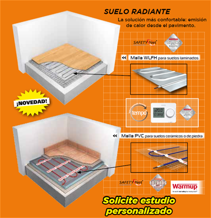 suelo radiante, una solución muy confortable al emitir calor desde el pavimento, ya sea suelo laminado o de piedra o cerámica. Preguntad en vuestro almacén de referencia, porque tenemos