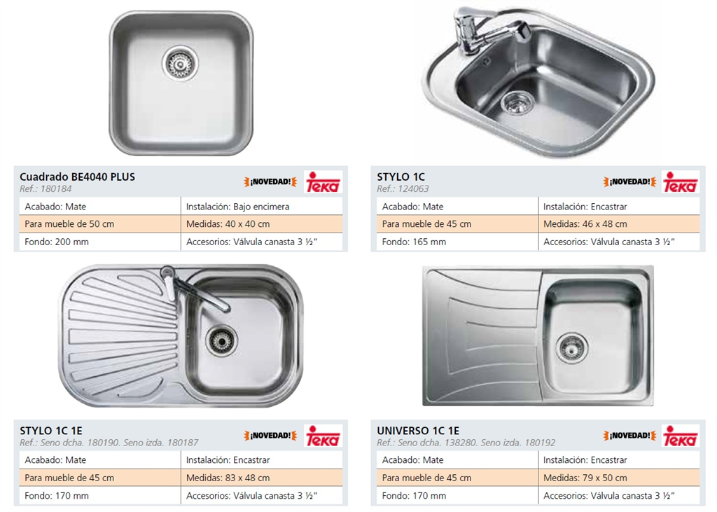 Los podéis encontrar de uno y dos senos, con escurridor encastrado, y de un seno y medio más escurridor. Todo para que vuestros clientes puedan elegir el que mejor convenga a sus necesidades.