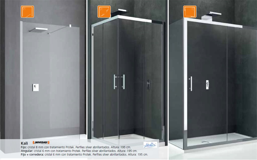 mampara Kali de Novellini, fabricada en cristal con tratamiento Protek, de fácil limpieza y con perfiles silver abrillantados.