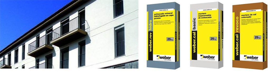 mortero de enfoscado mineral hidrofugado weber.rev hidro en capa gruesa (hasta 15 mm por capa), muy recomendado como base de un revestimiento final en fachadas, así como para enlucido de interiores, patios de luces, garajes, etc. Está disponible en sacos de 25 kg, en gris y en blanco.