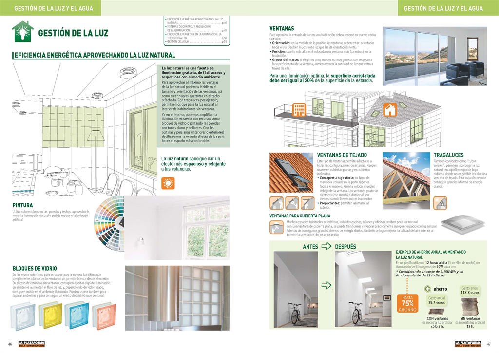 gestión de la luz y el agua e impermeabilización, con ejemplos concretos. Todo ello con propuestas de productos y materiales eficientes que ayudan a la reducción del gasto energético y las emisiones de CO2 de los edificios.