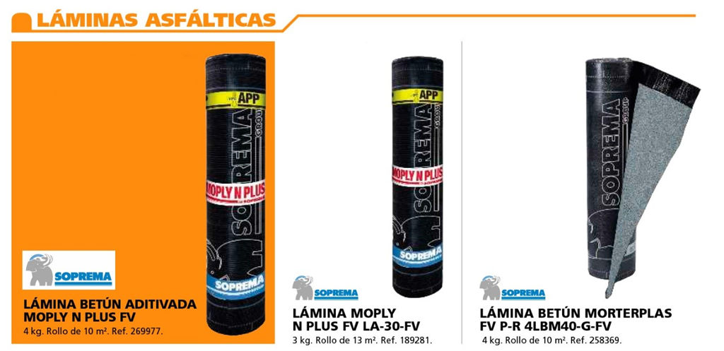 láminas asfálticas de Soprema, a base de betún modificado con plastómeros y armadura de poliéster o fibra de vidrio.
