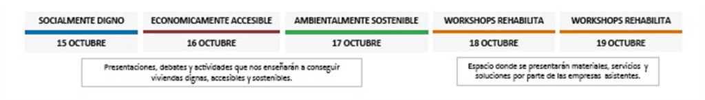 - La semana comenzará con unas Jornadas técnicas para profesionales y ciudadanos a las que podrás asistir del 15 al 17 de octubre en la Sala Cotxeres Palau Robert de Barcelona. Las secciones son Socialmente Digno, Económicamente Accesible y Ambientalmente Sostenible, respectivamente.