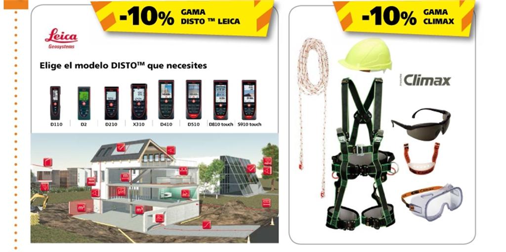 Los medidores y niveladores láser de Leica y el Equipamiento de Protección Individual de Climax, también tendrán un 10% descuento.