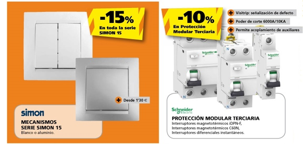 detectores de movimiento para control de iluminación y accesos de Dinuy y Xindar también tenemos bajada de precios. Y un 15% de descuento en la serie de mecanismos SIMON 15 y un 10% de descuento en protección modular terciaria de Schneider.