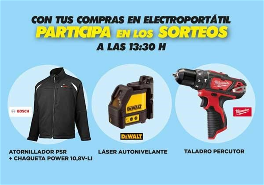 ¡cada día sortearemos fantásticos regalos! Con cada una de tus compras de alguna herramienta o consumible de la familia de Electroportátil podrás participar. Sólo tendrás que depositar la copia de tu factura en la urna que estará preparada en cada centro. ¿Queréis saber a qué premios podéis optar?