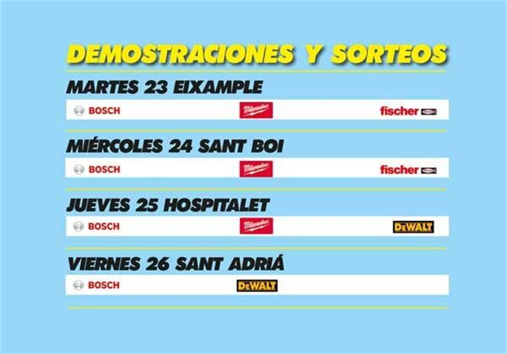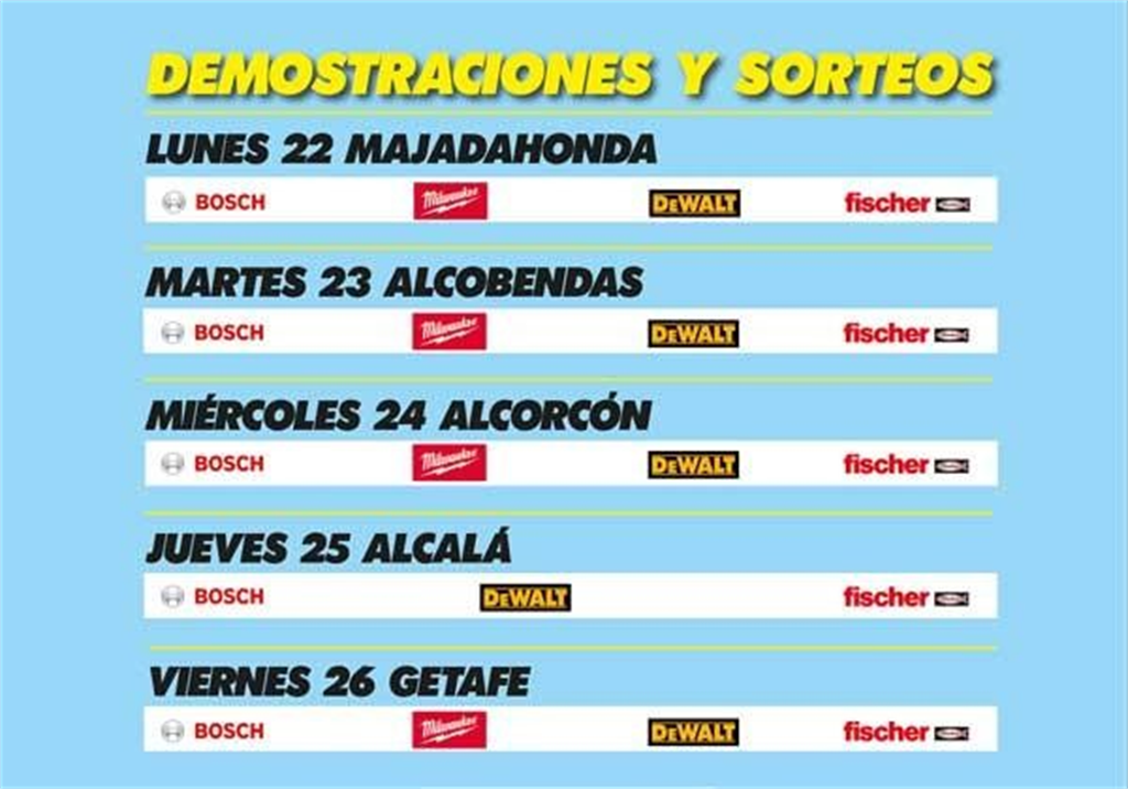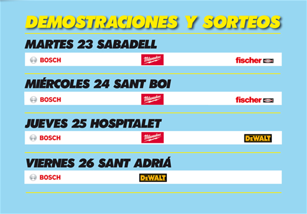 ¡Tendremos sorteos, demostraciones de productos y buena comida! Os invitaremos a desayunar y almorzar ¡habrá perritos calientes!Una jornada por almacén de La Plataforma, donde podréis conocer las últimas propuestas en consumibles y herramientas electroportátiles directamente de los profesionales expertos de Milwaukee, Dewalt, Bosch y Fischer. Además, cada uno de los fabricantes realizará