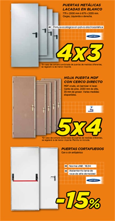 puertas cortafuegos. Además, tenemos una oferta de 4x3 en las metálicas lacadas en blanco y de 5x4 en hojas de puertas MDF con cerco directo, sin barnizar ni lacar. Pasaros a echar un vistazo porque tenemos