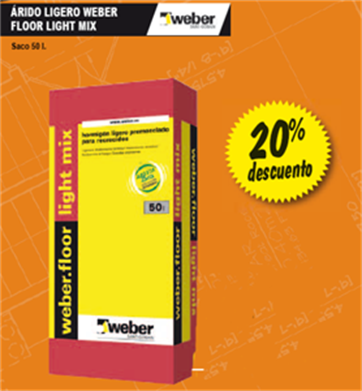 También encuentras con un 26% de descuento el pavimento Scala 30 de la marca Armstrong; es de vinilo acabado en poliuretano ( disponible en varios acabados) o el hormigón ligero y premezclado weber floor light mix, cuyo saco de 50 kilos tenemos al 20% de descuento durante todo el mes.
