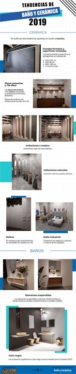 Cevisama, la gran feria de cerámica y baño, ha celebrado su mejor edición en la Feria de Valencia desde el 28 de enero al 1 de febrero. En esta exposición, que ha acogido a más de 90.000 visitantes, se han mostrado las últimas tendencias en el diseño y decoración de todo tipo de espacios, marcando las reglas y tendencias de este 2019. Desde La Plataforma no hemos querido perdernos este gran evento de más de 100.000 metros cuadrados para ver todas las novedades en innovación y diseño. En nuestra visita a Cevisama hemos recopilado las tendencias de baño y cerámica que despuntan este año y que muy pronto trasladaremos a nuestras exposiciones de Baño y Cerámica, abiertas a profesionales y particulares. En la siguiente #infografía te mostramos las últimas tendencias en materia de baño y cerámica para 2019. ¿La gran protagonista? Los elementos en piedra natural e imitación a materias, tanto en pequeño como en gran formato. Si te ha gustado esta infografía, descargártela a través de este enlace. Te esperamos en a nuestras tiendas exposiciones de Baño y Cerámica.