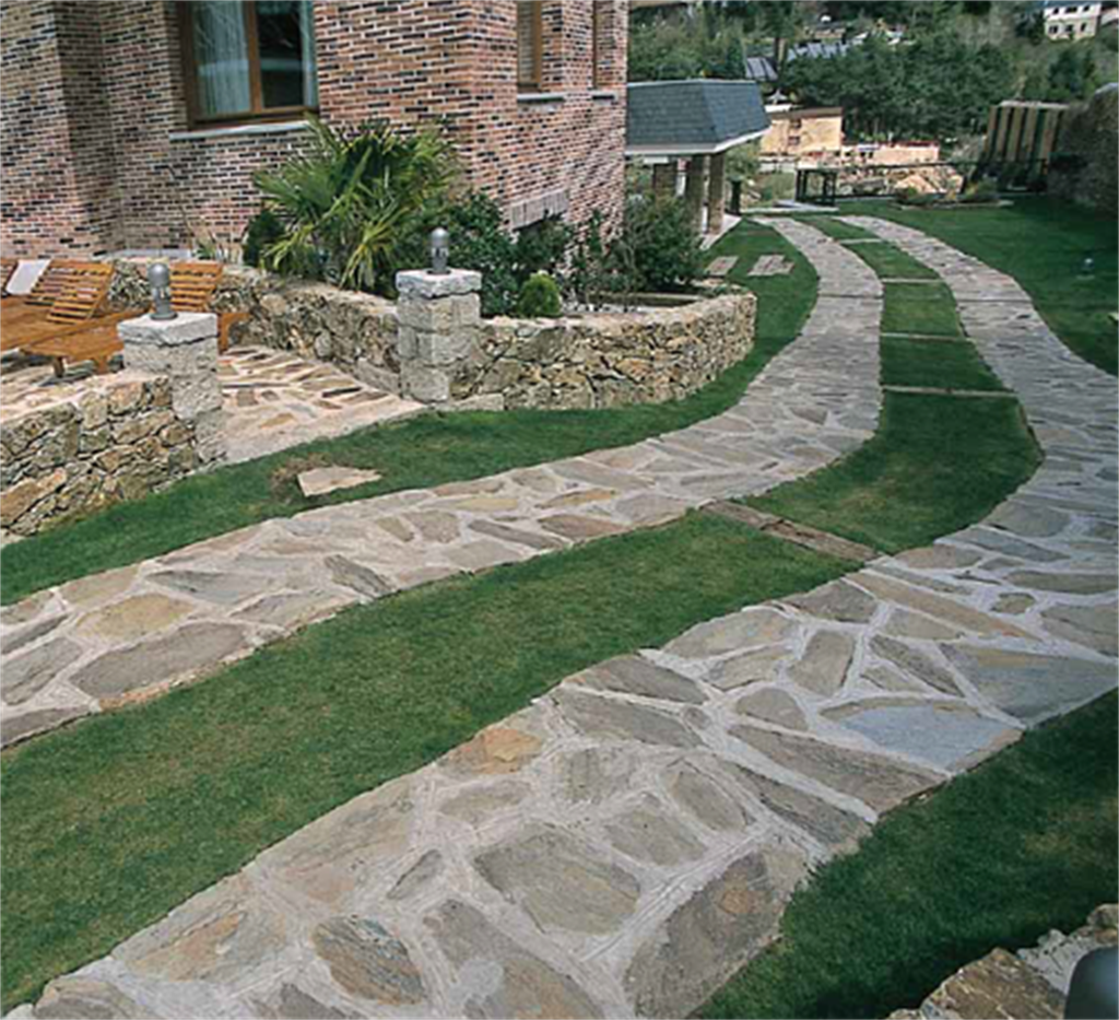 piedra natural para el jardín, azulejos imitación gresite para los baños y