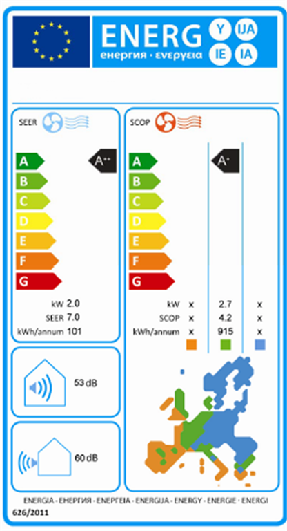 etiquetado energético de equipos. En concreto, para equipos con una potencia de salida a efectos de refrigeración de hasta 12 kW se hizo obligatoria una etiqueta energética que clasifica los aparatos en una escala que va desde la D (los menos eficientes) hasta la A+++ (para los más eficientes). En el diseño de la etiqueta, que es igual para toda Europa, el texto se ha sustituido por iconos.